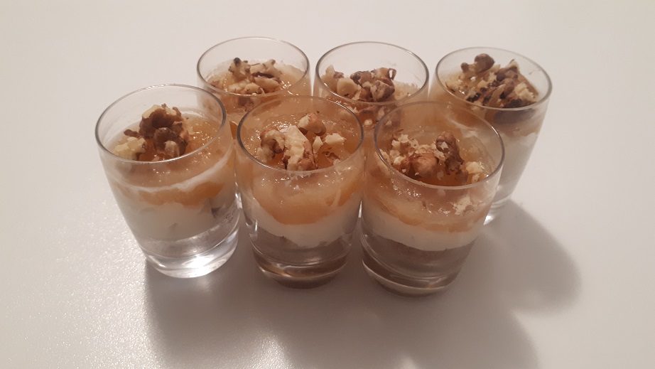 Ultimate i bicchierini con uno strato di composta di pere e zenzero e decorate con pezzetti di noci.