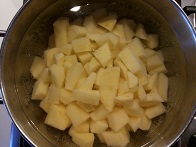 Sbucciate le patate e tagliatele nel modo che preferite: io suggerisco a tocchetti medio-piccoli, ma vanno bene anche a tocchetti grandi, a fettine o a spicchi; sciacquatele bene sotto l’acqua corrente (favorisce l’eliminazione dell’amido) e fatele bollire per 5 minuti in acqua salata (1).