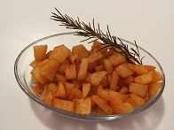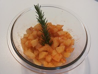 Mettetele in una ciotola e conditele con olio e sale. Aggiungete la paprika e il rosmarino e lasciate insaporire per una decina di minuti (2).