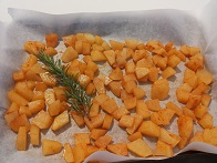 Mettete le patate in una teglia foderata di carta forno (3) e cuocete in forno preriscaldato a 220° per 30 minuti.
