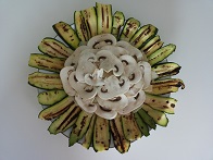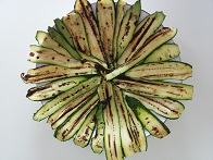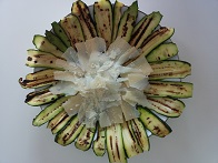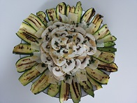Lavate le zucchine e grigliatele (1); disponetele a raggiera su un piatto da portata (2) e ponete al centro le scaglie di grana, tagliate sottili (3). Disponete i funghi crudi a fette sopra le scaglie di grana (4).