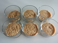 Tritate i biscotti e trasferiteli in una ciotola (1); aggiungetevi il burro (precedentemente fuso) e amalgamate bene il tutto. Versate il composto di burro e biscotti sbriciolati nelle coppette da monoporzione e compattate bene la base di biscotto (2,3), magari con l’aiuto di un bicchiere (basterà inserirlo nella coppetta e spianare il composto).