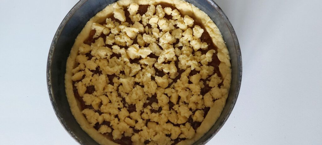 Poi passata a decorare la superficie della vostra Crostata morbida alla marmellata. Se volete potere realizzare le classiche losanghe, ma data la consistenza di questa pasta frolla lievitata, io vi consiglio di “sbriciolarla” sulla superficie. La vostra Crostata morbida alla marmellata dopo la cottura risulterà bellissima!