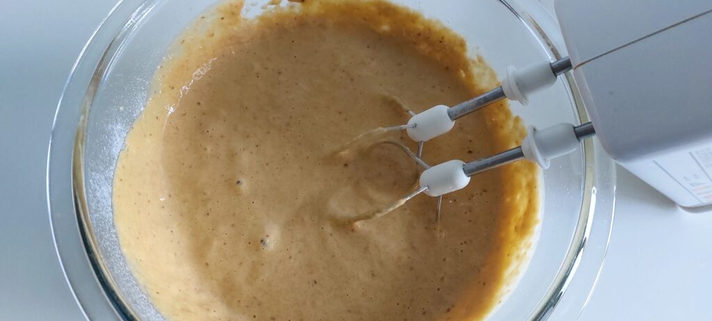Aggiungete poi, al composto di farina e uova, la purea di pesche ottenuta, insieme al latte rimasto, al lievito e alla vanillina. Mescolate bene il tutto fino a ottenere un composto liscio e cremoso.
