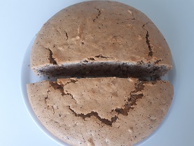 Una volta cotta la torta, lasciatela raffreddare e mettetela su un piatto. Tagliatela in due parti ma non proprio a metà: utilizzerete la parte più grande (4).