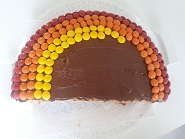 Procedete al decoro dividendo m&m e Smarties in bicchieri e tazzine differenti in base ai colori che utilizzerete (così sarà più facile la procedura). Una volta scelta la metà più grande della torta, ponetela sul piatto su cui la servirete (una volta decorata sarebbe complicato spostarla) e spalmate la superficie di un leggero film di nutella, poi procedete a decorare la torta secondo i colori dell’arcobaleno, la nutella fungerà da “collante” (5).