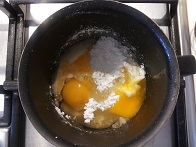 Mettete in un pentolino antiaderente le uova, il burro, lo zucchero a velo e il succo del limone. Ponete sul fuoco dolcissimo (1) e mescolate con una frusta (2, 3) per alcuni minuti.