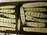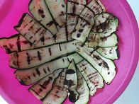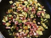 Lavate le zucchine e tagliatene 2 a pezzetti che metterete in una padella con la pancetta (senza bisogno di condimento perchè cuoceranno nel grasso della pancetta), ricordando di regolare di di sale e di pepe (2); mentre la padella è sul fuoco tagliate la restante zucchina a fette e grigliatele (3).