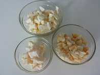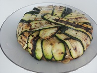 Mentre gli anelletti lessano, tagliate la provola, la mozzarella e il taleggio a cubetti (4) e preparate il vostro stampo: cospargetene il fondo con 2 cucchiai di pane grattato e poi foderatelo con le fette di zucchine graigliate (5).