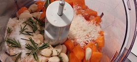 Per realizzare il vostro Pesto di carote e frutta secca, fate a pezzi le carote, dopo averle spellate, e ponetele nel mixer insieme a mandorle, a noci, parmigiano, sale, olio e agli aghi di rosmarino (precedentemente sciacquati e privati dei rametti).