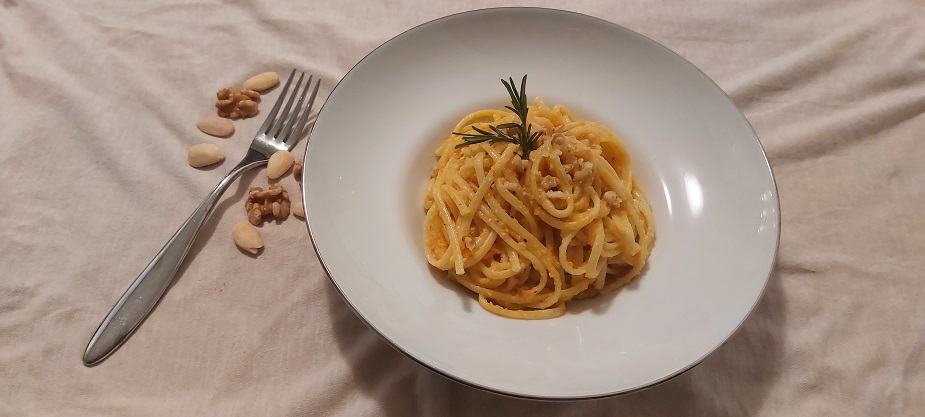 Potete servire la pasta al Pesto di carote e frutta secca con una manciata di noci sbriciolate sopra.