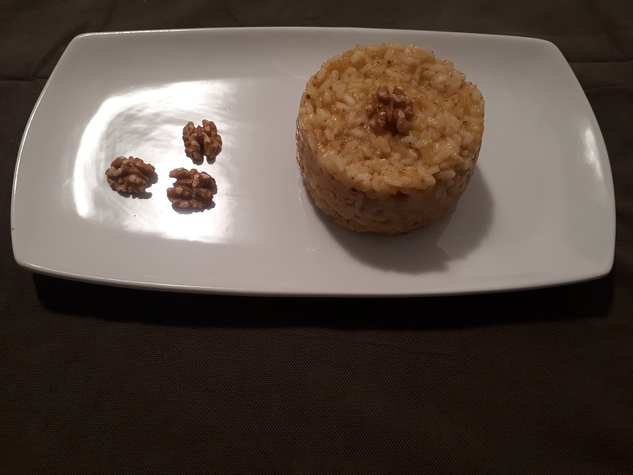 A fine cottura sbriciolate sul risotto le noci, mescolate e lasciate riposare per 2-3 minuti. Potete tenere qualche noce intera per la decorazione del piatto.