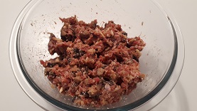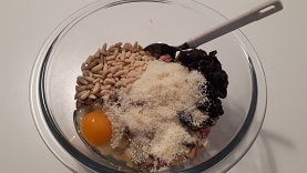 In una ciotola riunite la salsiccia privata del suo budello, le castagne e le prugne tagliate, i pinoli, il parmigiano grattugiato, il prezzemolo tritato e l’uovo. Mescolate il tutto con le mani affinché risulti un composto omogeneo.