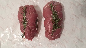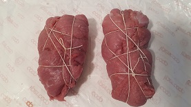 Io ho scelto il lato della maggior lunghezza e in questo modo l’arrosto è risultato molto lungo: l’ho tagliato in due parti, ho spinto in dento la farcitura alle estremità risultanti dal taglio e ho proceduto a legare con lo spago da cucina i due arrosti ottenuti.