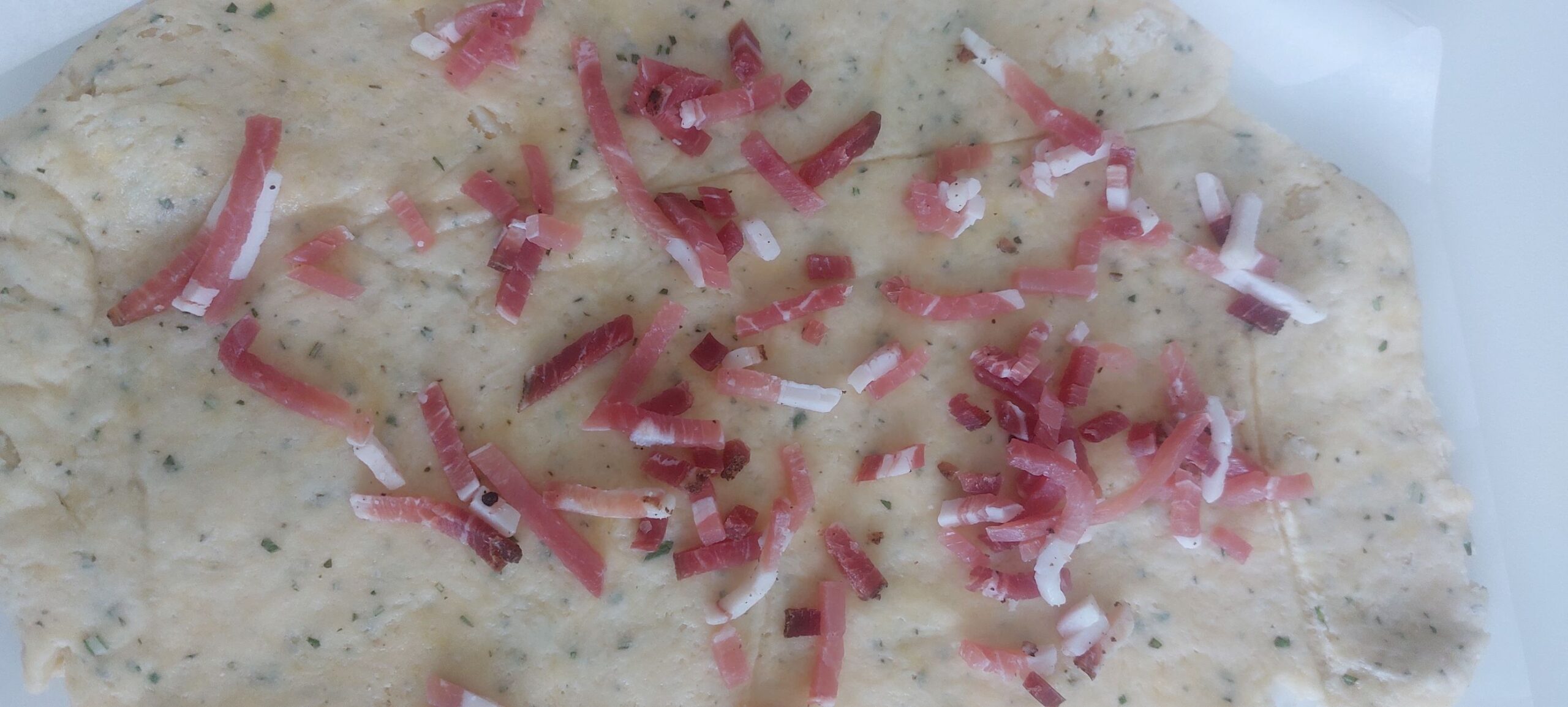 Stendete il panetto con un matterello e ponete sopra lo speck a striscioline.