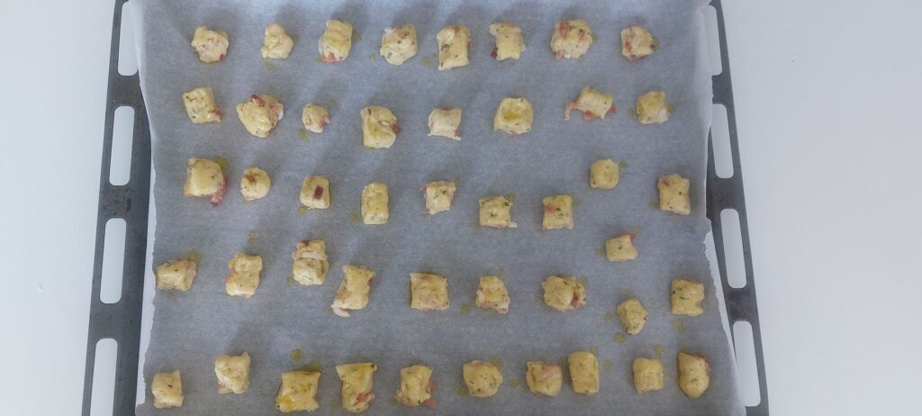 Disponeteli su una teglia rivestita di carta forno e spennellateli di olio (oppure con dell’uovo se preferite).
