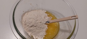 Aggiungete poi anche la farina e continuate a mescolare con la forchetta.
