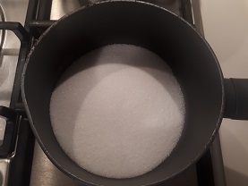 Preparate il caramello: mettete un pentolino sul fuoco con lo zucchero (1) e l’acqua (2), senza mescolare.