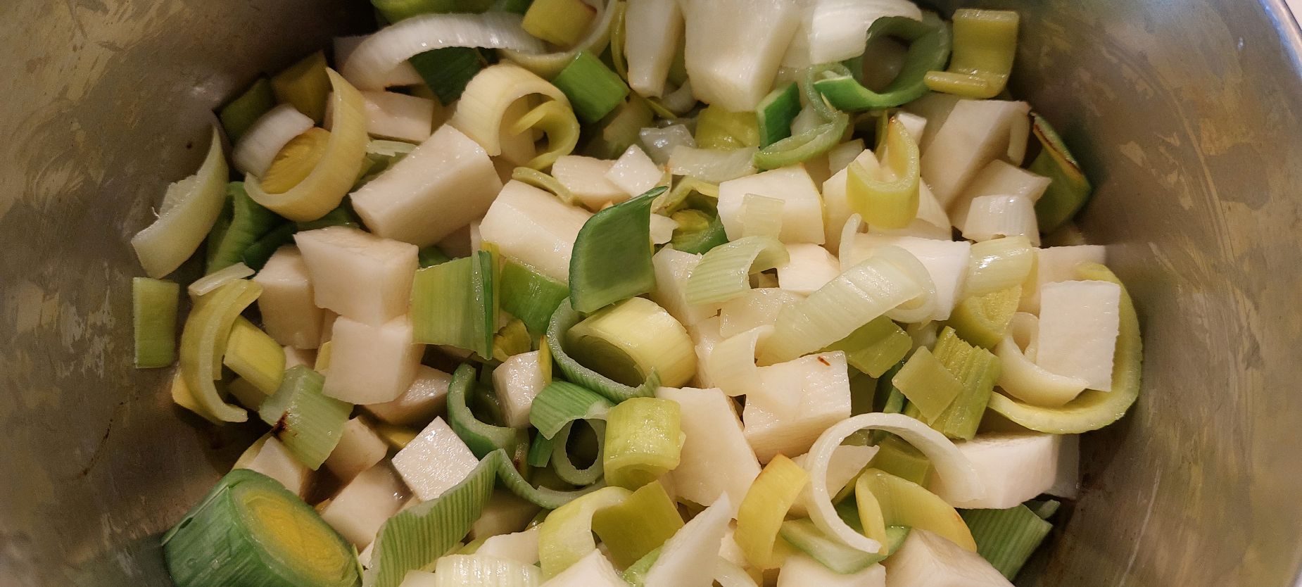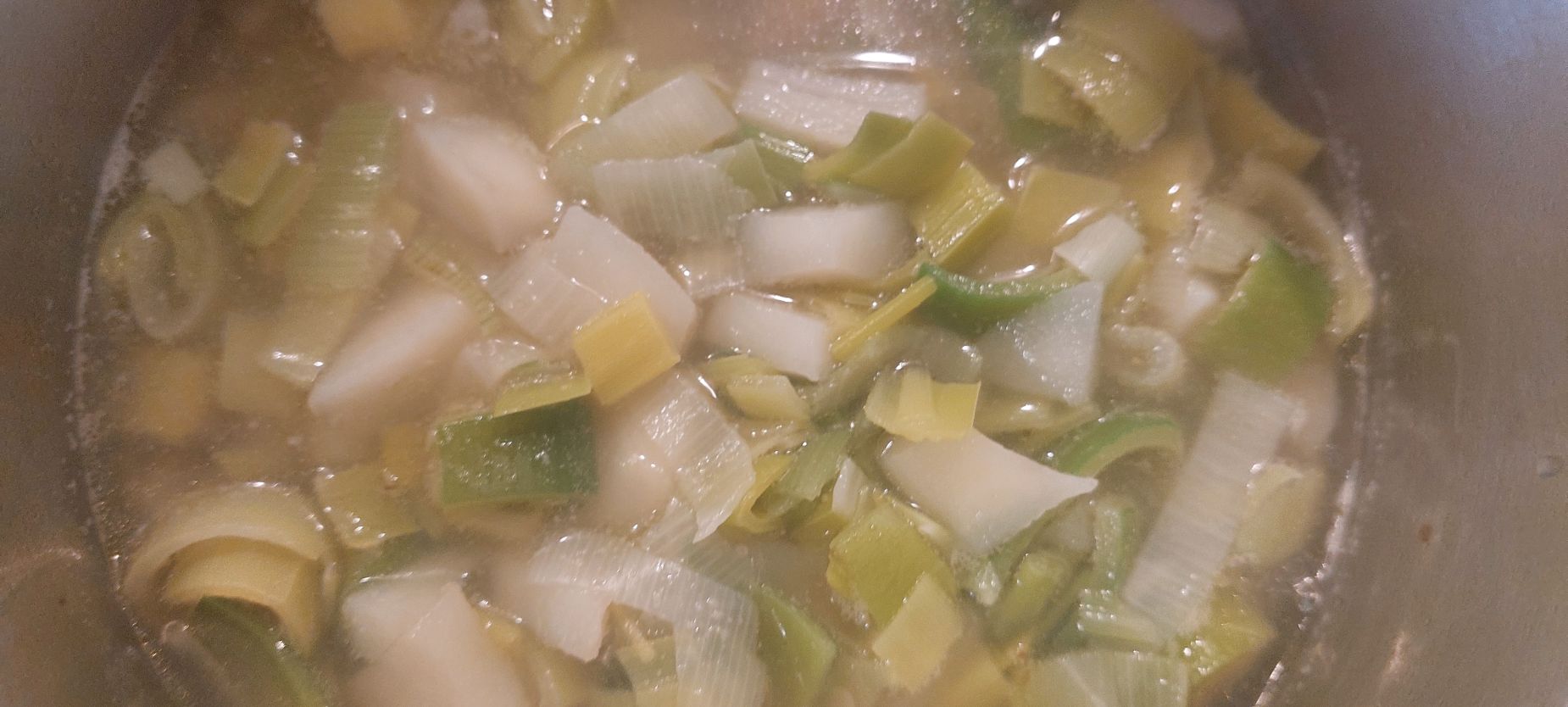 Per realizzare la vostra Crema di porri e patate con pancetta e cavolo nero croccanti, iniziate sbucciando le patate e tagliandole a pezzetti. Fate lo stesso con il porro e mettete tutto in una pentola sul fuoco con un filo d’olio.