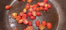 Mentre l’acqua bolle e poi la pasta lessa, sbucciate l’aglio (se non lo gradite potete evitarlo) e fatelo imbiondire in una padella sul fuoco con un filo di olio. Aggiungete i pomodorini, preventivamente sciacquati e tagliati a metà. Lasciateli sul fuoco basso per 5 minuti.