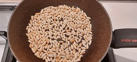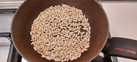 Per realizzare il vostro Pesto di limoni e capperi, iniziate tostando i pinoli in un padellino per alcuni minuti.