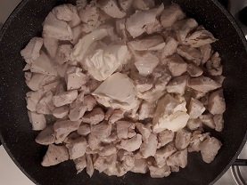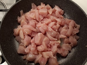 Tagliate i petti di pollo a pezzetti e fateli rosolare sul fuoco con il burro, regolando di sale e di pepe (3, 4).
